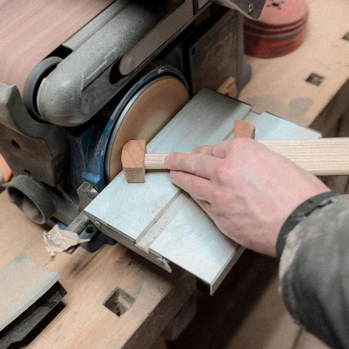 Pēc formas izveides visas zobena virsmas tiek slīpētas ar slīpmašīnu.